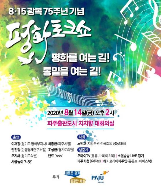 [KNT한국뉴스타임] 8.15 광복 75주년을 기념해 한반도 평화의 의미를 되새기고 미래를 전망해보는 ‘평화토크쇼’가 오는 14일 오후 2시 파주출판도시 지지향 대회의실에서 개최된다.