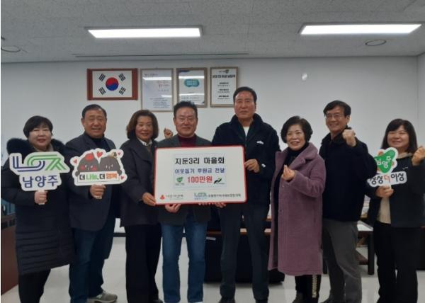 [한국뉴스타임=편집국] 남양주시 수동면 지둔3리 마을회는 18일 어려운 이웃을 위한 후원금 100만원을 경기사회복지공동모금회를 통해 수동면에 지정 기탁했다.