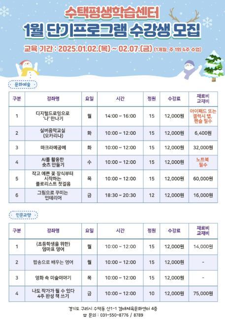 이번 단기프로그램에 대한 신청은 12월 20일 오전 10시부터 구리시통합예약포털에서 구리시민 우선 접수를 시작으로 선착순으로 가능하다.