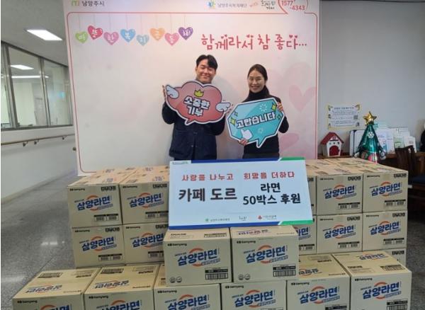 [한국뉴스타임=편집국] 남양주시 화도읍에 소재한 카페 도르는 지난 18일, 남양주시 사회복지관 동부희망케어센터에 라면 50상자(120만 원 상당)를 전달했다.