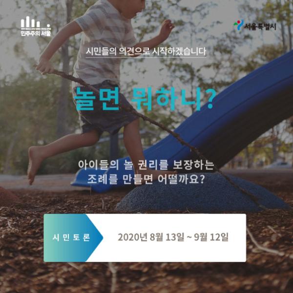 [KNT한국뉴스타임] 서울시가 한 초등학생의 제안을 실현하기 위해 시민들과 머리를 맞댄다. 서울시는 시민참여 플랫폼 ‘민주주의 서울’ (democracy.seoul.go.kr) 에서 “아이들의 놀 권리를 보장하는 조례를 만들면 어떨까요?”라는 주제로 온라인 시민토론을 시작한다. 8월 13일부터 9월 12일까지 한 달 동안 토론이 진행되고, 시민 누구나 참여할 수 있다.