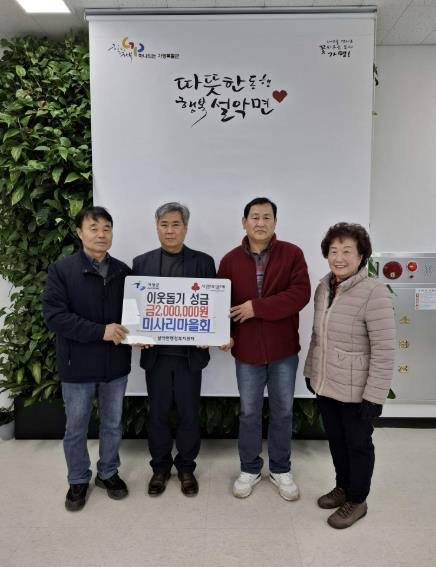 [한국뉴스타임=편집국] 가평군 설악면 미사리마을회가 지난 27일 설악면행정복지센터를 방문해 성금 200만 원을 기탁했다. 이번 성금은 마을 주민들이 한뜻으로 모은 것으로, 설악면 관내 어려운 이웃을 돕는 데 사용될 예정이다.