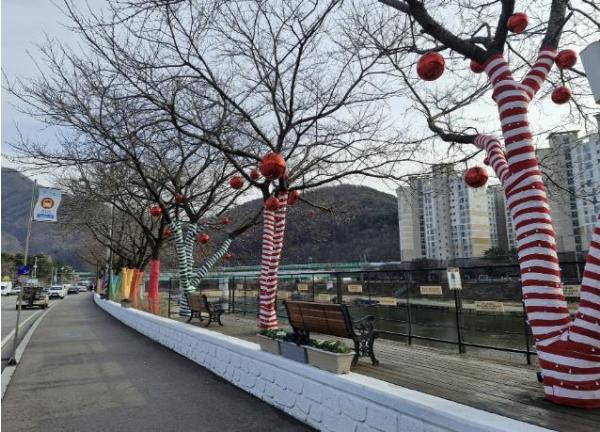 이번 사업은 나무 옷뿐 아니라 △태양광 패널을 활용한 친환경 전구 설치 △꽃양배추 화분 배치 △데크와 의자 등 휴식 공간 마련 △글귀와 시의 한 구절이 담긴 나무 명패 배치 등으로 구성해 더욱 다채로운 거리를 완성했다.