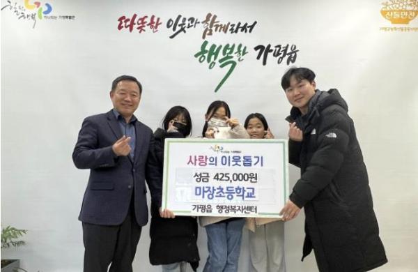 [한국뉴스타임=편집국] 가평마장초등학교는 최근 가평읍 행정복지센터를 방문해 학생자치회가 운영한 바자회 수익금 42만5천원을 이웃을 위한 기부금으로 전달했다.