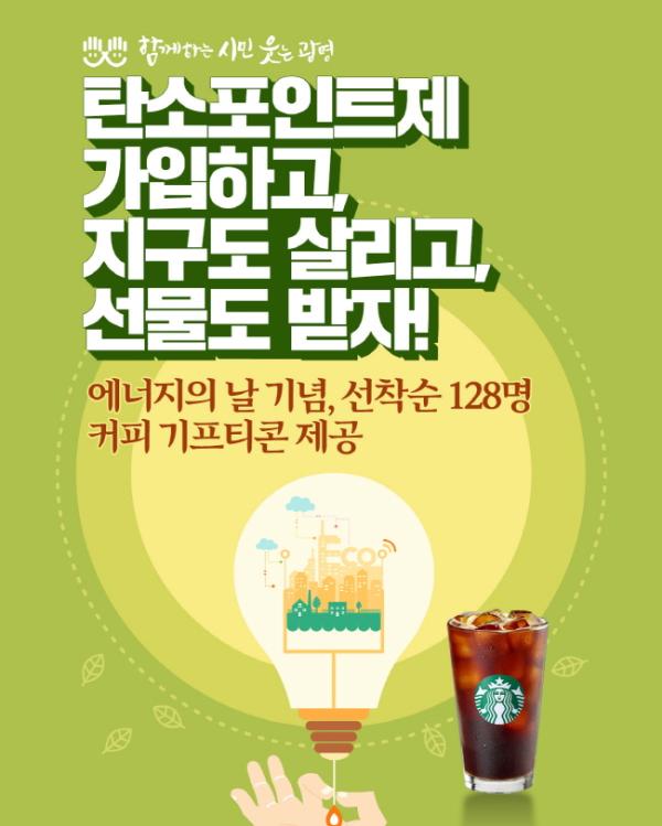 광명시(시장 박승원)는 오는 22일 광명시「에너지의 날」을 맞아 14일부터 탄소포인트제에 가입하면 선착순 128명에게 커피 기프티콘을 지급하는 행사를 진행한다.