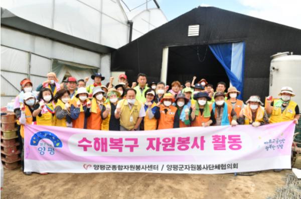 사상 유례없던 장마와 폭우로 큰 피해를 입어 특별재난지역으로 선포된 안성시에 대하여 양평군자원봉사센터는 대한적십자양평지구협의회 외 4개 단체(민간기동순찰자율방범대, 양평군자율방재단, 아름다운동행, 해병대전우회) 32명의 봉사단을 구성하여 일죽면 피해농가를 방문하여 비닐하우스 시설 복구작업에 구슬땀을 흘렸다.