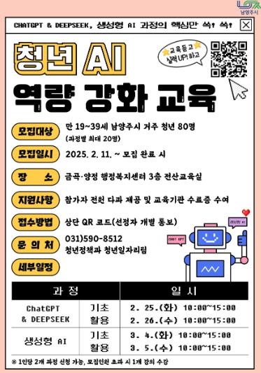[한국뉴스타임=편집국] 남양주시는 청년들의 취업 및 창업 역량 강화를 위한 ‘청년 AI 역량 강화 교육’의 수강생 80명을 모집한다고 12일 밝혔다.