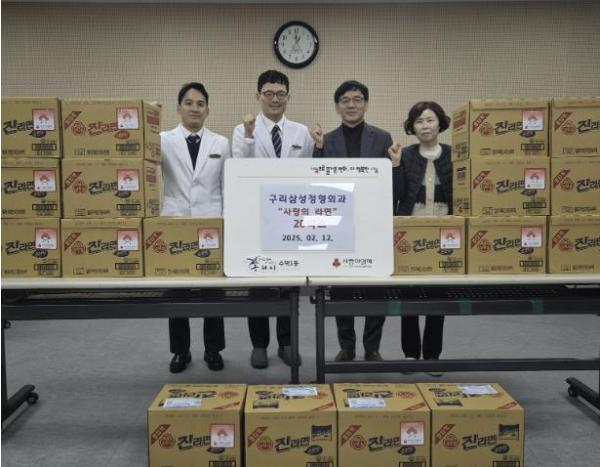 [한국뉴스타임=편집국] 구리시 수택1동행정복지센터는 2월 12일 구리삼성정형외과로부터 ‘사랑의 라면’ 20박스를 이웃돕기 후원품으로 전달받았다.