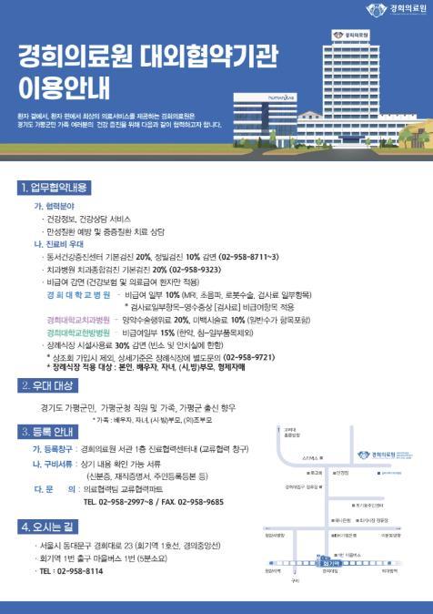 가평군과 경희의료원은 2012년부터 상호 협력 관계를 유지하고 있는데, 군민 건강증진을 위해 최근 협약을 다시 체결했다. 이에 따라 가평군민은 경희의료원 이용 시 기본 건강검진비 및 비급여 진료비 일부 감면, 장례식장 시설 사용료 30% 할인 등의 혜택을 받을 수 있다. 협약에 따라 경희의료원 임직원도 가평군 주요 관광지 이용 시 입장료 할인을 적용받는다.