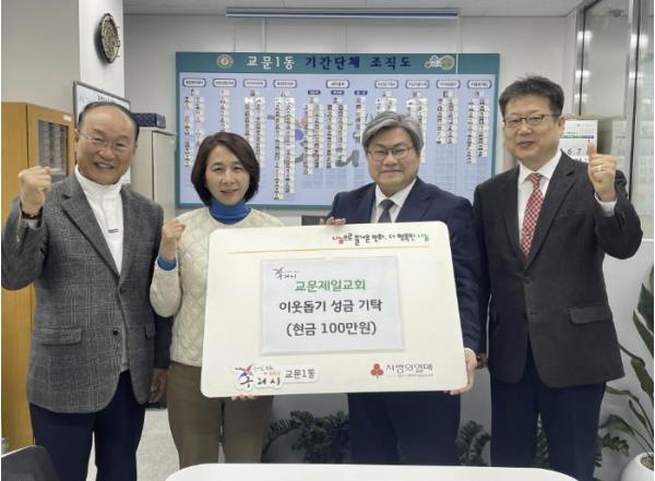 이진수 교문1동장은“지역사회의 어려운 이웃들을 위해 따뜻한 나눔을 실천해 주신 교문제일교회와 성도님들께 깊은 감사를 드린다.”라며, “오늘 전달받은 성금은 교문1동의 취약계층을 돕는 데 소중히 사용될 것이며, 앞으로도 지역사회에 희망을 전하는 나눔 활동이 계속되기를 바란다.”라고 말했다.