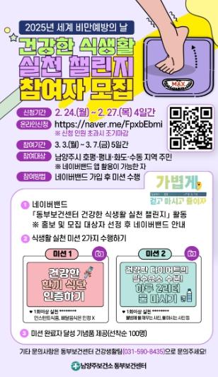 이번 챌린지는 남양주시가 보건복지부와 한국건강증진개발원(KHEPI)과 협력해 추진하는 캠페인으로, 비만 예방 관리에 관심이 있는 남양주시 호평·평내·화도·수동 지역 주민을 대상으로 한다.
