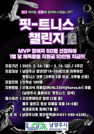 [한국뉴스타임=편집국] 남양주시는 2월 24일부터 3월 14일까지 3주간, ‘청년 핏트니스 챌린지’ 참여자를 공개 모집한다고 21일 밝혔다