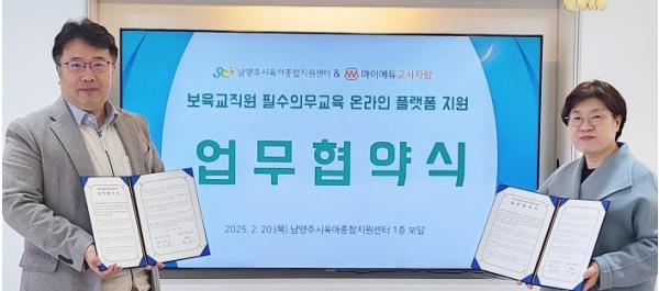 [한국뉴스타임=편집국] 남양주시육아종합지원센터와 ㈜마이에듀는 지난 20일 ‘보육교직원 대상 비대면 교육 플랫폼 지원’을 위한 업무협약을 체결했다.