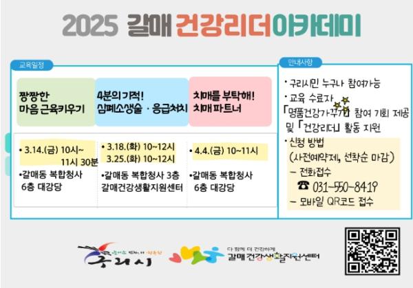 [한국뉴스타임=편집국] 구리시 갈매건강생활지원센터는 “갈매동 주민을 대상으로 주민 주도형 건강증진사업의 기반이 되는 건강 지도자 양성을 위해 「2025년 갈매 건강리더 아카데미 2기」 교육생을 모집한다.”라고 24일 밝혔다.