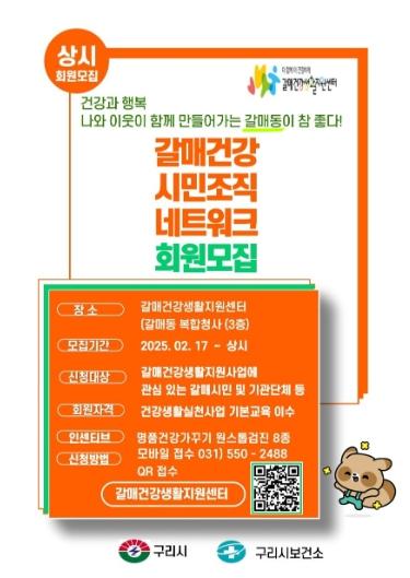 [한국뉴스타임=편집국] 구리시 갈매건강생활지원센터는 주민 주도형 건강증진사업 강화를 위해갈매동 주민과 기관단체를 대상으로 갈매건강 시민조직 네트워크 체계를 확립하여 본격적으로 가동한다고 밝혔다.