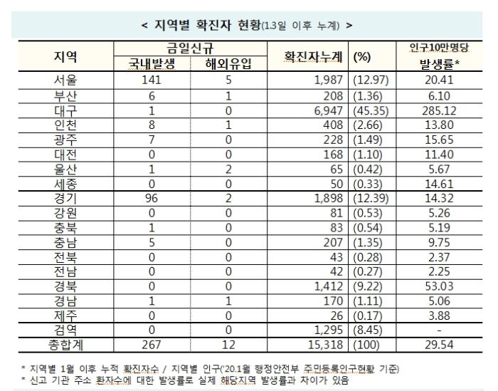 [KNT한국뉴스타임=명기자] 질병관리본부 중앙방역대책본부(본부장 정은경)는 16일 0시 기준으로, 국내 발생 신규 확진자는 267명이 확인되었고, 해외유입 사례는 12명이 확인되어 총 누적 확진자수는 15,318명(해외유입 2,642명)이라고 밝혔다.