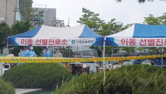 [한국뉴스타임=명기자] 18일 가평군 청평면 청평면사무소 주차장에 설치된 이동 선별진료소에서 코로나19 #7 지역확진자 접촉으로 검사대상자 562명 중 미검사를 검사하고 있다. 지역주민들은 불안한 마음에 아침 일찍 8시부터 진료소에서 대기 중임에도 9시가 넘어서야 검사가 개시 되었다.