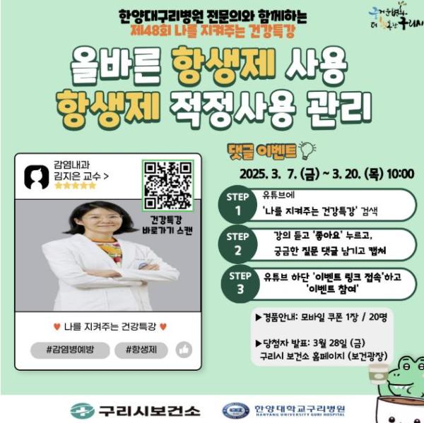 [한국뉴스타임=편집국] 구리시는 오는 3월 7일부터 ‘올바른 항생제 사용, 항생제 적정 사용 관리(ASP)’를 주제로 한 건강특강을 구리시 공식 유튜브 채널 구리비전을 통해 송출한다고 밝혔다.