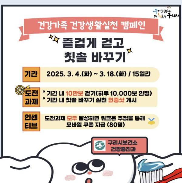 백경현 구리시장은 “소중한 가족과 함께 건강을 지키기 위한 꾸준한 걷기 습관 정착으로 대사질환을 예방하고 구강 건강의 기초인 칫솔 바꾸기 실천을 통해 치아 건강을 지키기 바란다.”라고 전했다.