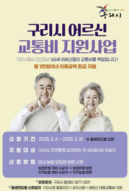 시는 지난해 1월, 구리시 어르신 대중교통비 지원 조례를 제정하고 9월부터 12월까지 4개월여 동안 5억여 원의 예산을 투입해 전산시스템을 개발하여 같은 해 12월 2025년 우선 필요한 사업비 5억원을 확보했으며, 이후 사업비 이용 인원 추이에 따라 추가로 예산을 확보한다는 방침이다.