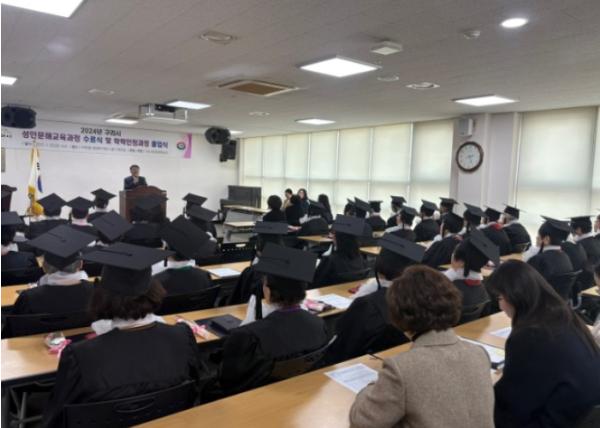 2024년 성인문해교육은 학습자의 학습 수준에 맞춰 초급, 중급, 학력인정3단계, 중등예비 등 4개 과정으로 나눠 2024년 3월 18일부터 2025년 2월 21일까지 추진했으며, 이 중 교육청 지침을 적용하여 66.6% 이상 출석한 45명의 학습자가 교육을 수료했다.