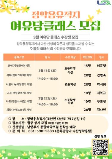 ‘여유당클래스’는 3월 15일부터 매월 1~2회 토요일 오후 2시부터 4시까지 정약용유적지에서 진행된다. 초등학생 이상 시민이라면 누구나 무료로 참여할 수 있으며, 남양주시 통합예약포털에서 사전 예약을 통해 신청할 수 있다.