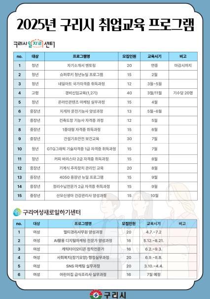 [한국뉴스타임=편집국] 구리시는 일자리 창출 지원을 위해 시민들에게 취업역량 강화 프로그램을 무료로 제공하는 ‘2025 비용 ZERO 취업지원 프로그램’을 추진한다고 밝혔다.