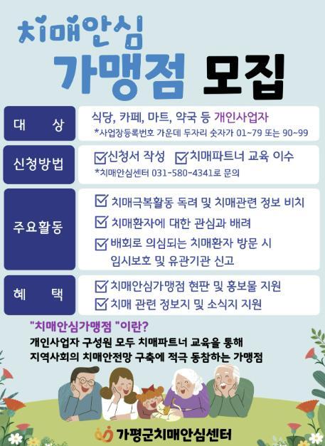[한국뉴스타임=편집국] 가평군치매안심센터는 치매 인식 개선과 돌봄 안전망 강화를 위해 ‘치매안심가맹점’을 상시 모집한다고 31일 밝혔다.