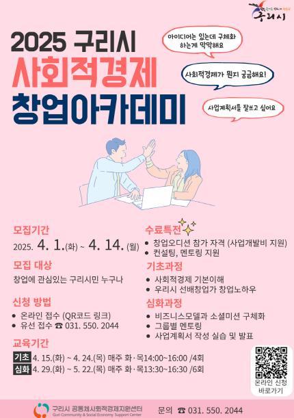 [한국뉴스타임=편집국] 구리시는 오는 4월 14일까지 사회적경제에 관심 있는 시민과 예비 창업자를 대상으로 ‘2025년 구리시 사회적경제 창업아카데미’ 참여자를 모집한다고 밝혔다.