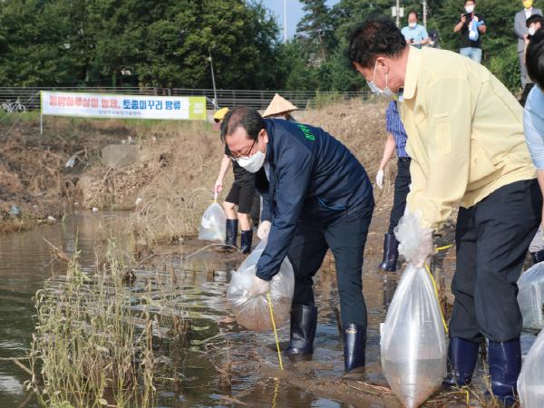 남양주시(시장 조광한)는 동양하루살이 방제를 위해 18일 와부읍 궁촌천 하류에서 토종 미꾸리 1만 마리를 방류했다.