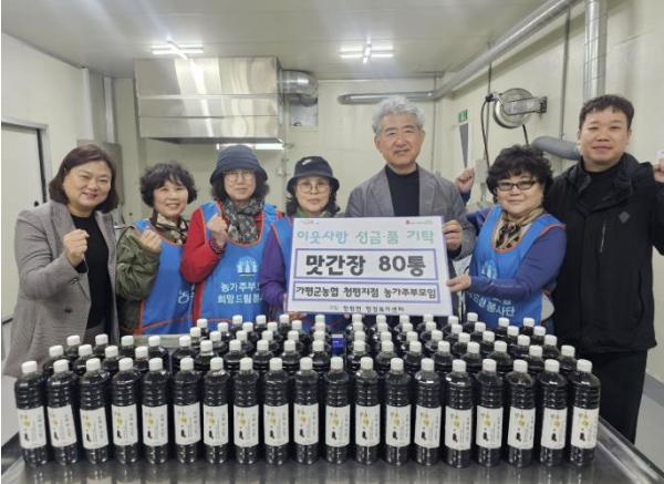 [한국뉴스타임=편집국] 가평군농협 청평지점 농가주부모임은 최근 지역 내 어려운 이웃을 위해 맛간장 80통을 청평면에 기탁하고 전달식을 가졌다.