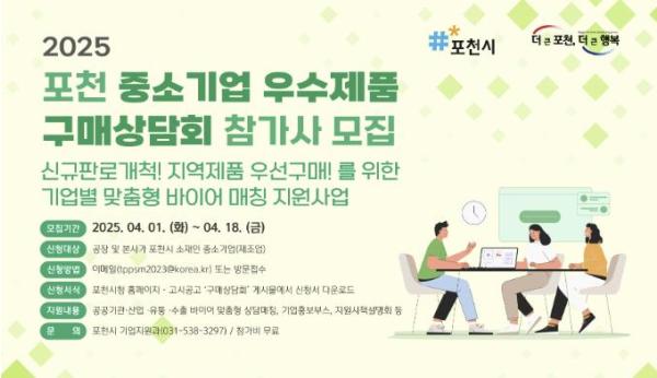 [한국뉴스타임=편집국] 포천시는 오는 18일까지 2025 포천 중소기업 우수제품 구매상담회에 참가할 관내 중소기업을 모집한다.