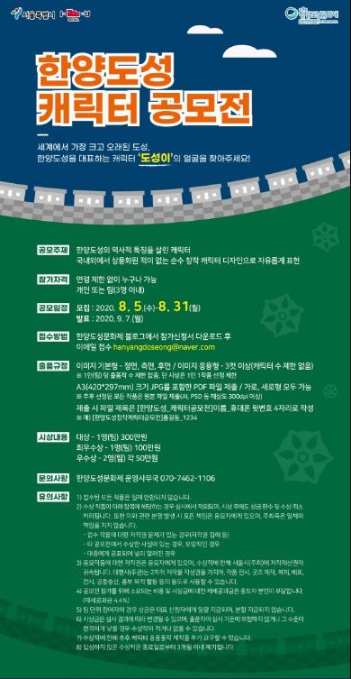 접수기간은 8.31.(월)까지로 국내외에 상용화 된 적이 없는 순수 창작 캐릭터 디자인이면 된다. 수상작은 한양도성의 마스코트가 되어 국내외 홍보에 활용되며, 제8회 한양도성문화제의 굿즈로 제작될 예정이다.