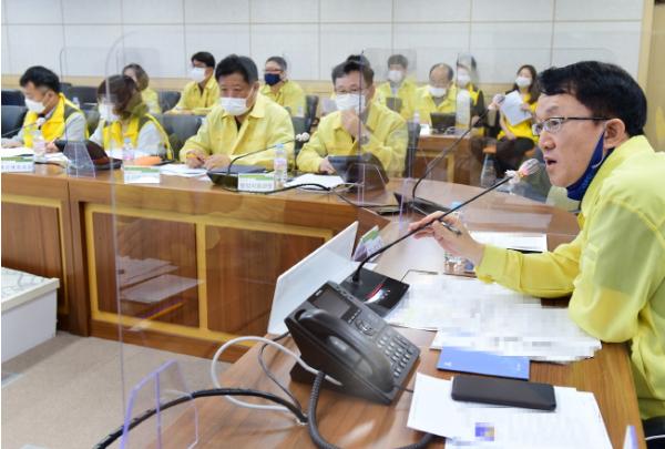 19일 시청 재난안전상황실에서 열린 ‘코로나19 대응 추진상황보고회’를 주재한 조청식 수원시 제1부시장은 “코로나19 확산을 막으려면 ‘강화된 사회적 거리두기 2단계’가 시행되는 동안 ‘일상을 멈추는 수준’으로 행동을 자제해야 한다”며 “지침 위반에 대해서는 행정력을 단호하고, 강력하게 행사해야 한다”고 강조했다.