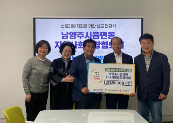 [한국뉴스타임=편집국] 남양주시는 지난 25일, 남양주시 읍면동 지역사회보장협의체가 영남지역 산불 피해 이재민을 돕기 위한 성금 350만 원을 남양주시복지재단에 전달했다고 28일 밝혔다.