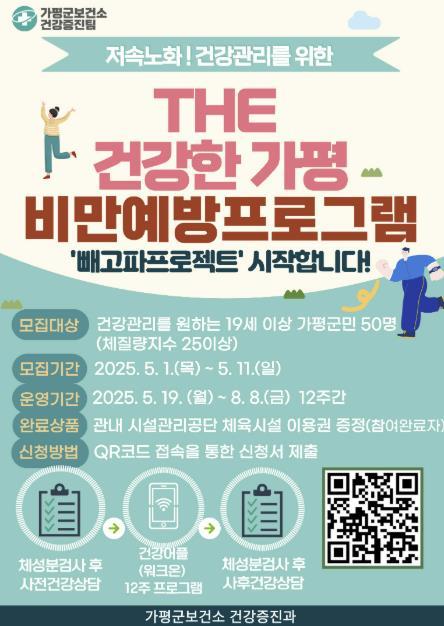 [한국뉴스타임=편집국] 가평군보건소는 5월 1일부터 5월 11일까지 건강관리를 위한 비만예방 프로그램인 ‘빼고파 프로젝트’ 참가자를 모집한다.