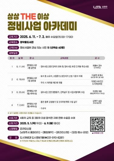 [한국뉴스타임=편집국] 남양주시는 정비사업에 대한 시민의 이해도 향상과 실무 역량 강화를 위해 오는 6월 11일부터 ‘상상 THE 이상 정비사업 아카데미’를 운영하며, 5월 1일부터 수강생을 선착순 모집한다고 밝혔다.