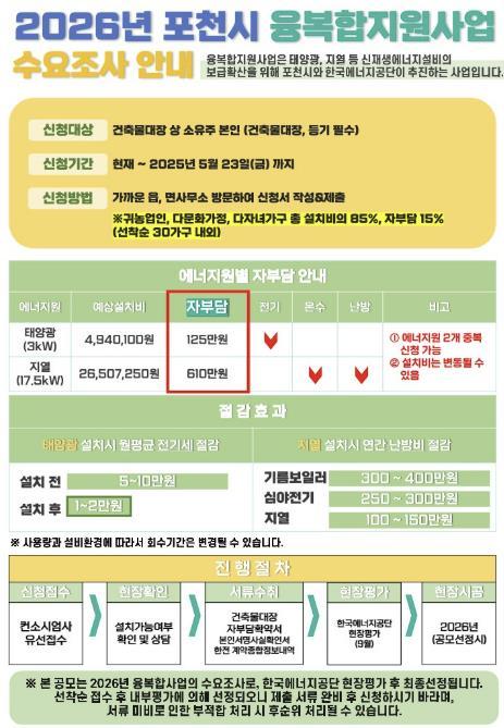 포천시는 인구 감소 관심 지역으로 지정된 만큼 인구 정책과 연계해 대상자 중 귀농인, 다자녀가정, 다문화가족 등에게는 자부담 비율을 기존 25%에서 15%로 완화(선착순 30가구)해 사업의 참여 문턱을 낮췄다.