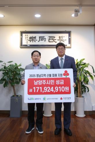 남양주시(시장 주광덕)는 16일, 남양주시복지재단이 영남지역 산불 피해 주민들을 돕기 위한 성금 171,924,910원을 경기 사회복지공동모금회에 전달했다고 밝혔다.