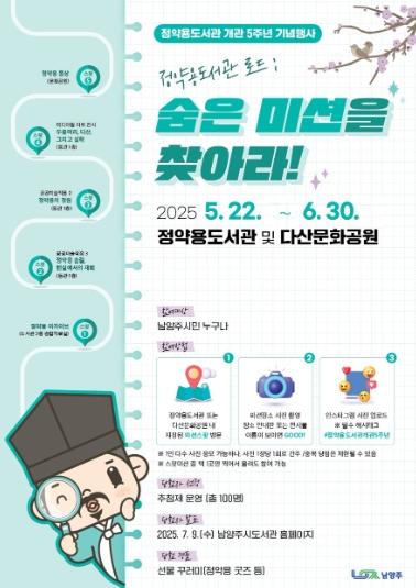[한국뉴스타임=편집국] 남양주시는 이달 22일부터 다음 달 30일까지, 정약용도서관에서 개관 5주년 기념 ‘정약용도서관 로드: 숨은 미션을 찾아라!’를 운영한다고 21일 밝혔다.