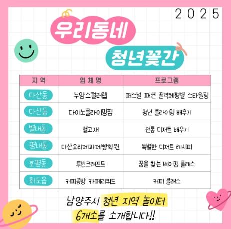 [한국뉴스타임=편집국] 남양주시는 청년들의 자유로운 문화·여가 활동을 지원하기 위해 운영할 지역별 청년 전용 공간인 ‘우리동네 청년꽃간’ 6개소를 최종 선정했다고 21일 밝혔다.