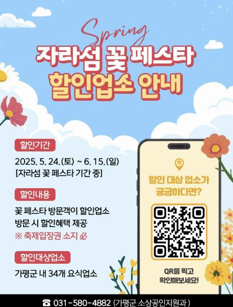 군에 따르면 24일부터 6월 15일까지 진행되는 이번 꽃 축제 기간 동안 가평군 내 음식점, 카페 등 34개 업소에서 방문객에게 할인 등의 혜택을 제공한다. 관광객은 자라섬 입구에 비치된 리플릿이나 전용 온라인 링크를 통해 할인업소를 확인할 수 있으며, 꽃 페스타 방문 영수증을 제시하면 해당 혜택을 받을 수 있다.