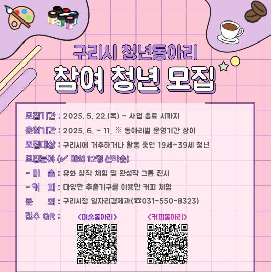 [한국뉴스타임=편집국] 구리시는 5월 22일부터 ‘2025년 구리시 청년동아리’에 참여할 청년을 모집한다고 밝혔다.