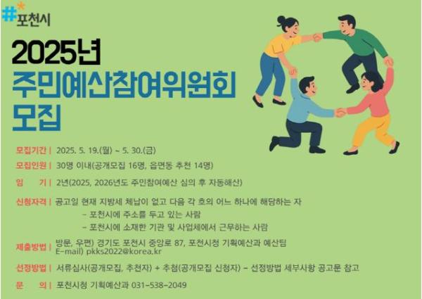 [한국뉴스타임=편집국] 포천시는 오는 30일까지 2026년도 예산 편성을 위한 주민참여예산위원회 위원을 공개 모집한다.