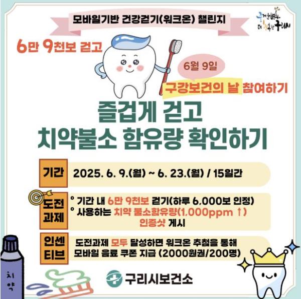 [한국뉴스타임=편집국] 구리시는 ‘제80회 구강보건의 날’(6월 9일)을 맞아 시민들의 구강건강과 신체활동 증진을 위한 ‘즐겁게 걷고, 치약불소 함유량 확인하기’ 챌린지를 9일부터 23일까지 15일간 운영한다고 밝혔다.