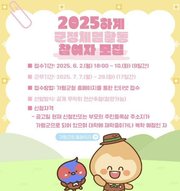 [한국뉴스타임=편집국] 가평군이 지역 청년들에게 군정 이해와 공직경험 기회 제공을 위해 ‘2025년 하계 대학생 군정체험활동’ 참여자 66명을 모집한다.