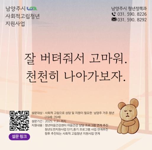 설문 대상은 남양주시에 거주하며 사회적 고립으로 인해 상담이나 지원이 필요한 청년이며, 네이버 폼(웹 포스터 큐알코드 참고)을 통해 접수하면 된다.