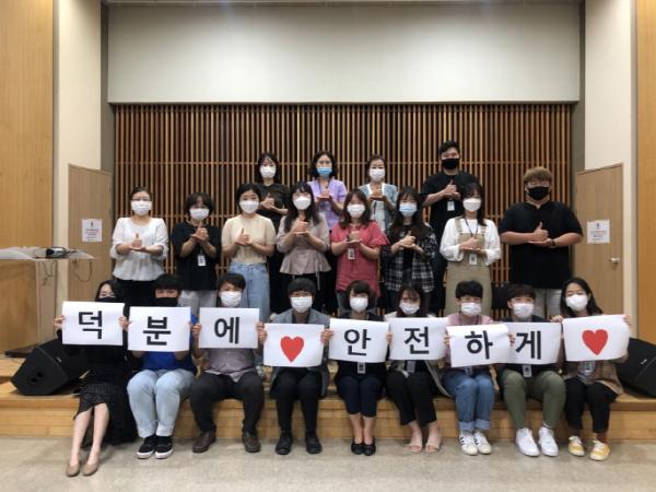 ‘덕분에 캠페인’은 복지관 이용 어르신 및 종사자, 지역주민까지 약 100여명이 참여한 가운데 ‘의료진 덕분에’ 챌린지 제스처를 취한 사진을 응원 문구와 함께 현수막으로 제작하여 진행했다.