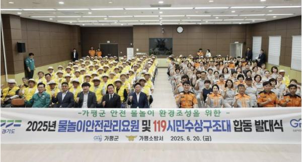 [한국뉴스타임=편집국] 가평군은 20일 가평소방서와 공동으로 ‘2025년 물놀이 안전관리요원 및 119시민수상구조대 합동발대식’을 개최했다.