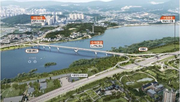 수석대교는 남양주시 수석동과 하남시 선동을 잇는 교량으로, 연장 794m·폭원 24.9m 규모로 조성되며, 교량 건설과 함께 하남시 선동 IC부터 서울 강동구 강일 IC까지 올림픽대로를 확장하는 사업도 포함된다.